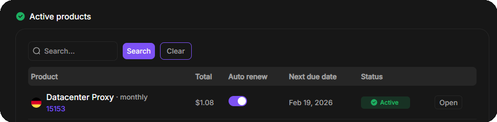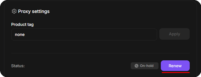If the automatic renewal function is disabled, the proxies will wait (Status <mark style="color:$warning;">On-hold</mark>) manual payment; to do this, you need to click in the order ![](https://3044836706-files.gitbook.io/~/files/v0/b/gitbook-x-prod.appspot.com/o/spaces%2F3l0uO4OV4DD1gK4uKGC6%2Fuploads%2Fgit-blob-6fc930a3046d0b58fee633875e343942ab4e1894%2Fimage.png?alt=media)