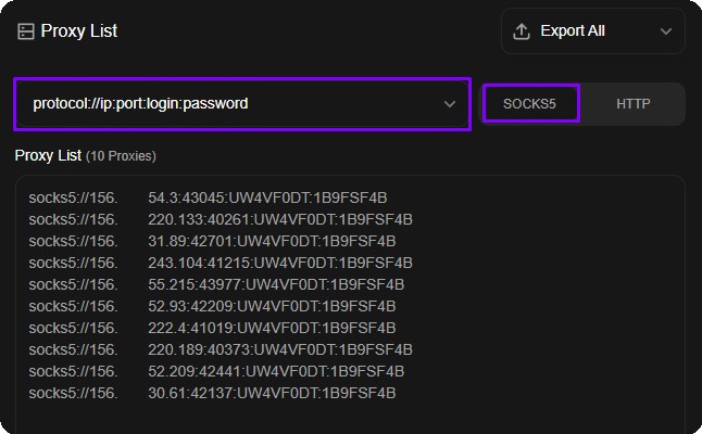 Перед добавление прокси, мы советуем в панели вашего заказа указать тип форматирования прокси и протокол подключения SOCKS5.